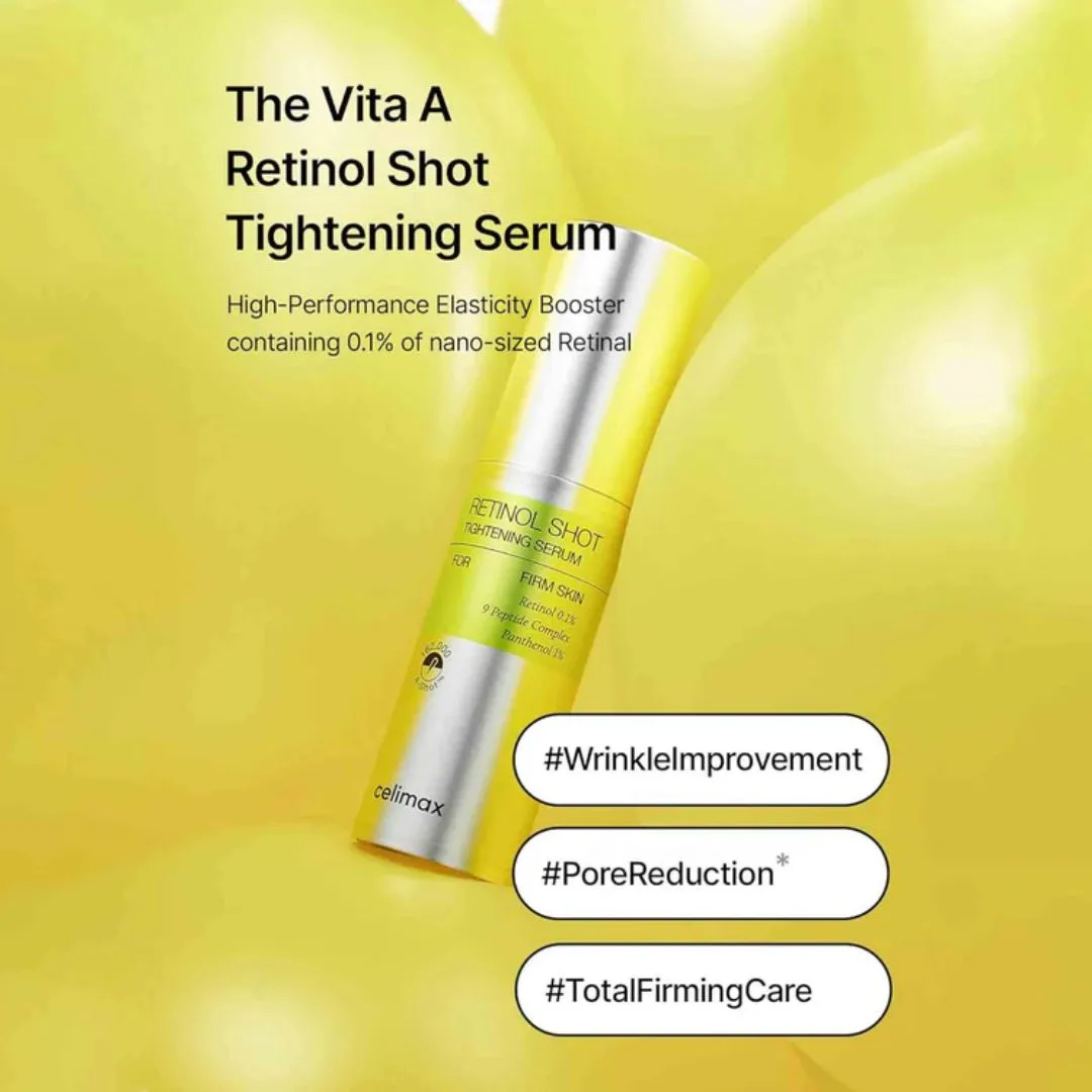 Retinol Shot Tightening Serum de Celimax es un suero facial concentrado diseñado para mejorar la firmeza, suavizar líneas finas y refinar la textura de la piel.