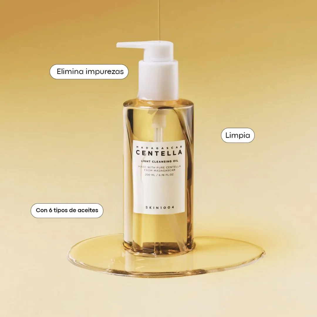 SKIN1004 Centella Light Cleansing Oil está formulado para disolver maquillaje, protector solar y exceso de sebo sin comprometer la barrera de tu piel.